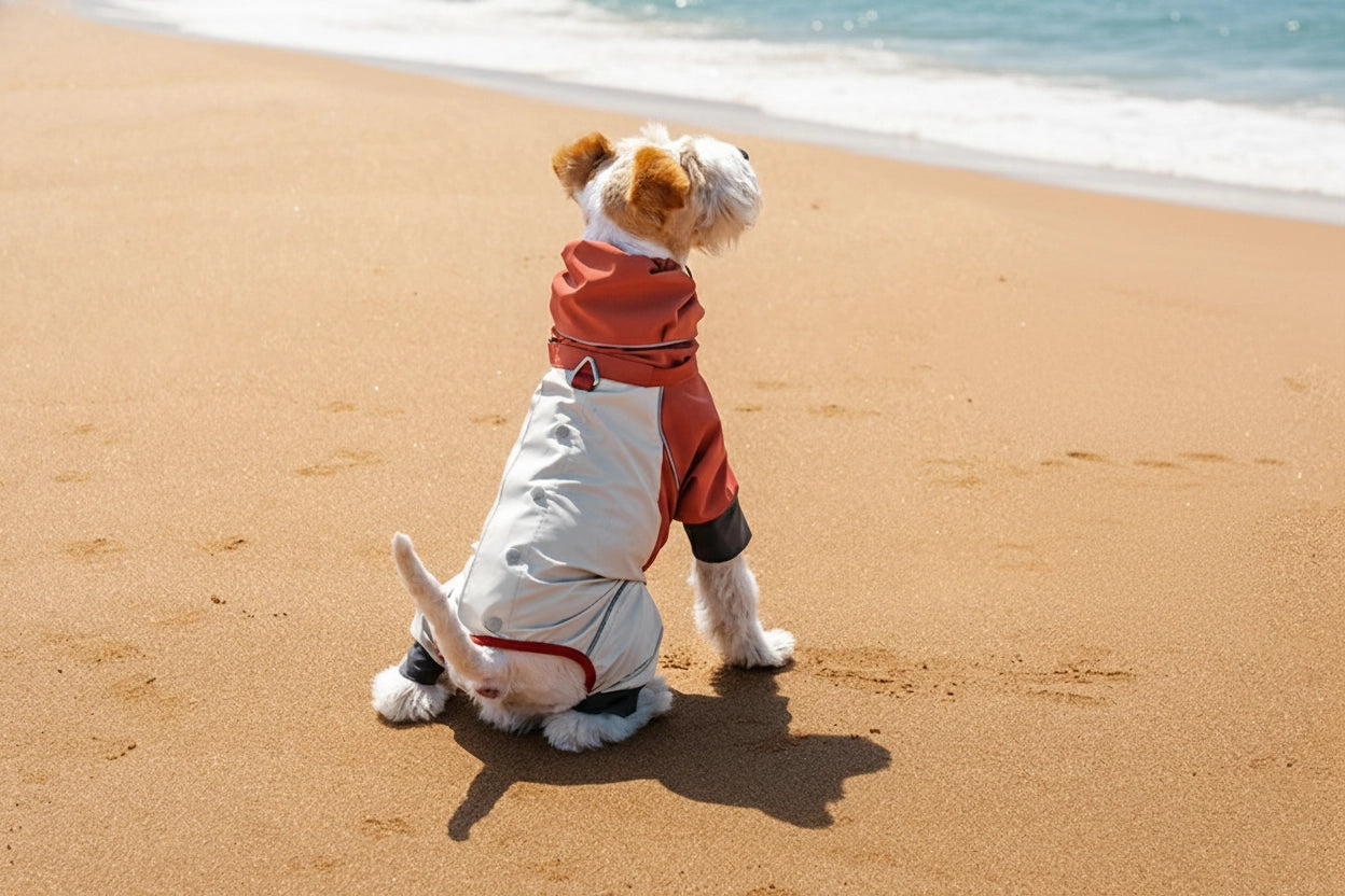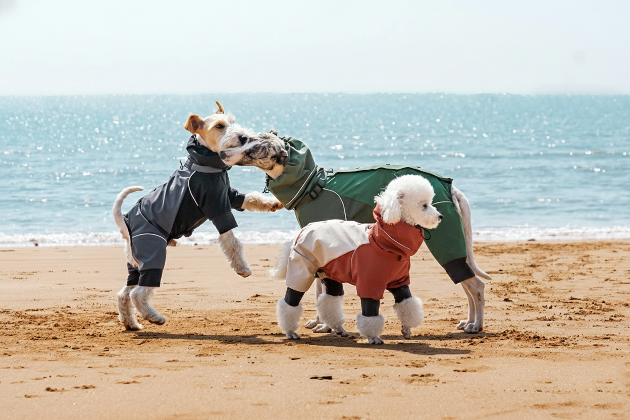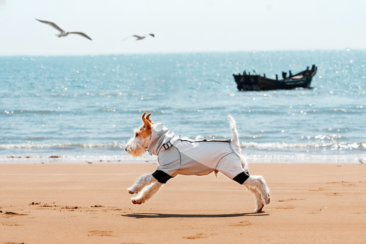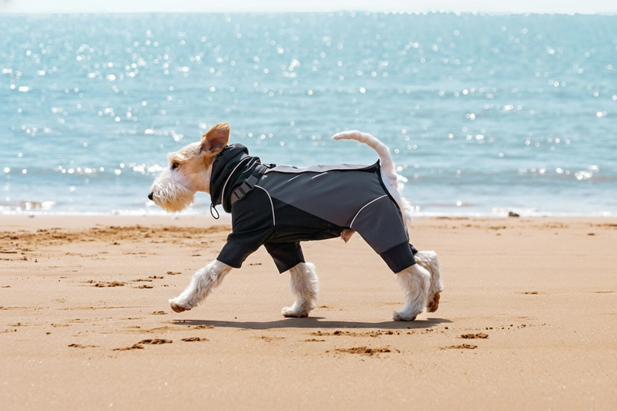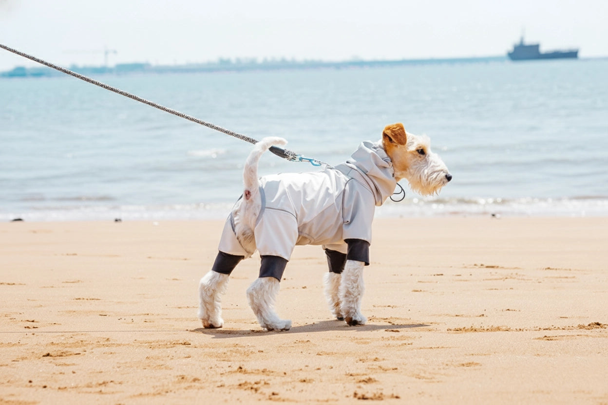 Das Design mit vier Beinen bietet einen erweiterten Schutz und reduziert so Spritzwasser, Schlamm und Feuchtigkeit auf dem Fell des Hundes. Dieser Stil ist praktisch, um die Sauberkeit bei Aktivitäten im Freien zu gewährleisten und das Fell des Hundes bei Regenwetter trockener zu halten. Der eng anliegende Kragen und die vollständige Abdeckung des Körpers schützen vor Wind bei leichtem bis mäßigem Regen.