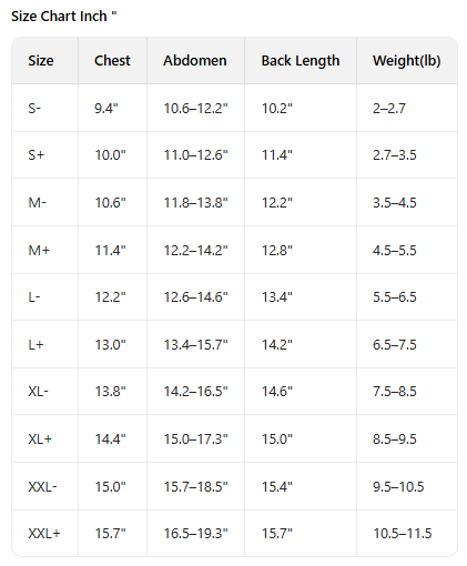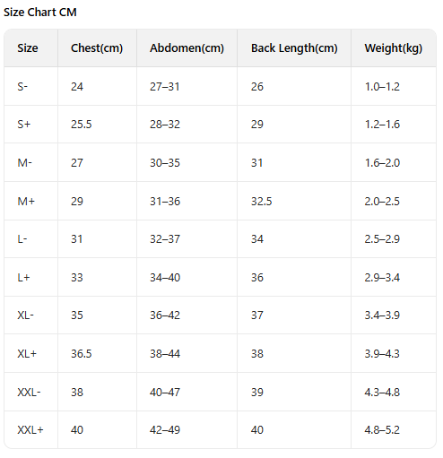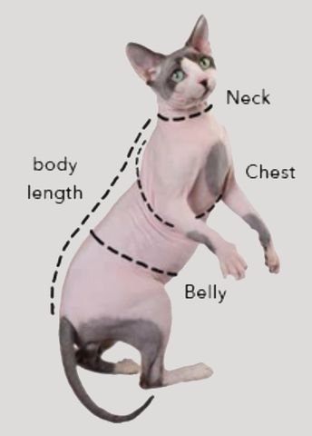 Sizing Tip: For the best fit, choose the size based primarily on Back Length, then check Chest, Abdomen, and Weight. If your cat is between sizes, selecting the larger size is usually more comfortable.