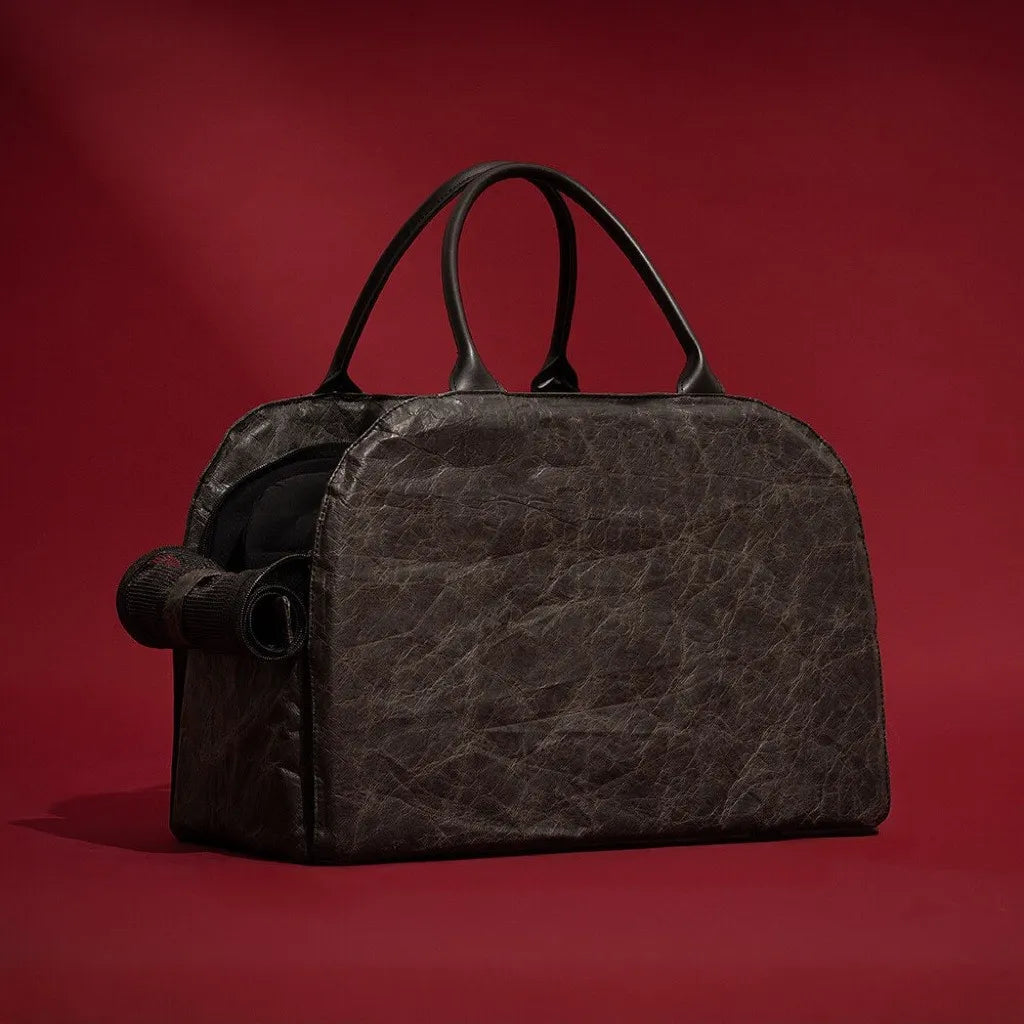 The carrier includes an adjustable shoulder strap and a built-in safety belt to help keep pets in place while the vehicle is moving.